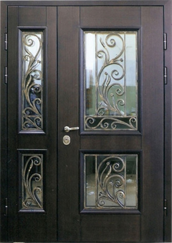 Входная металлическая дверь с порошковым покрытием стеклом и ковкой в частный дом №27